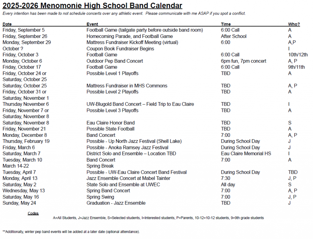 Printable 2025 – 2026 Band Calendar